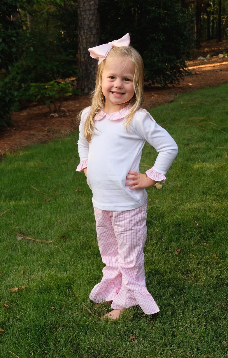 Our Girl's Long Sleeve Peter Pan Collar Tee is a classic boutique basic for your next embroidery or applique project! Pair with our Girl's Gingham Ruffle Pants!